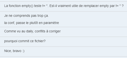 Il est capital de faire valider son code par ses collègues. De une parce que ceux-ci peuvent vous aider à vous évitez de faire passer une coquille. Qui n’a jamais laissé par mégarde un console.log dans son code ? Mais aussi parce qu’ils peuvent vous aider à vous améliorer sur une partie du code où ils auraient fait autrement.