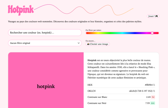 Hotpink vous permet de voyager au pays des couleurs web nommées, découvrir des teintes originales et leur histoire, et organiser et créer des palettes stylées.