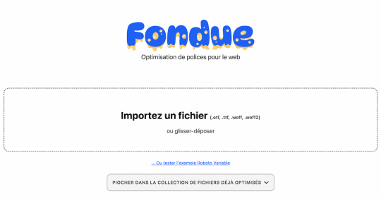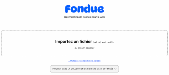 Fondue est un outil web moderne pour optimiser vos polices de caractères (subsetting) et les convertir au format WOFF2, standard actuel pour le web. Il est conçu pour être simple, rapide et respectueux de la vie privée, fonctionnant entièrement dans votre navigateur.